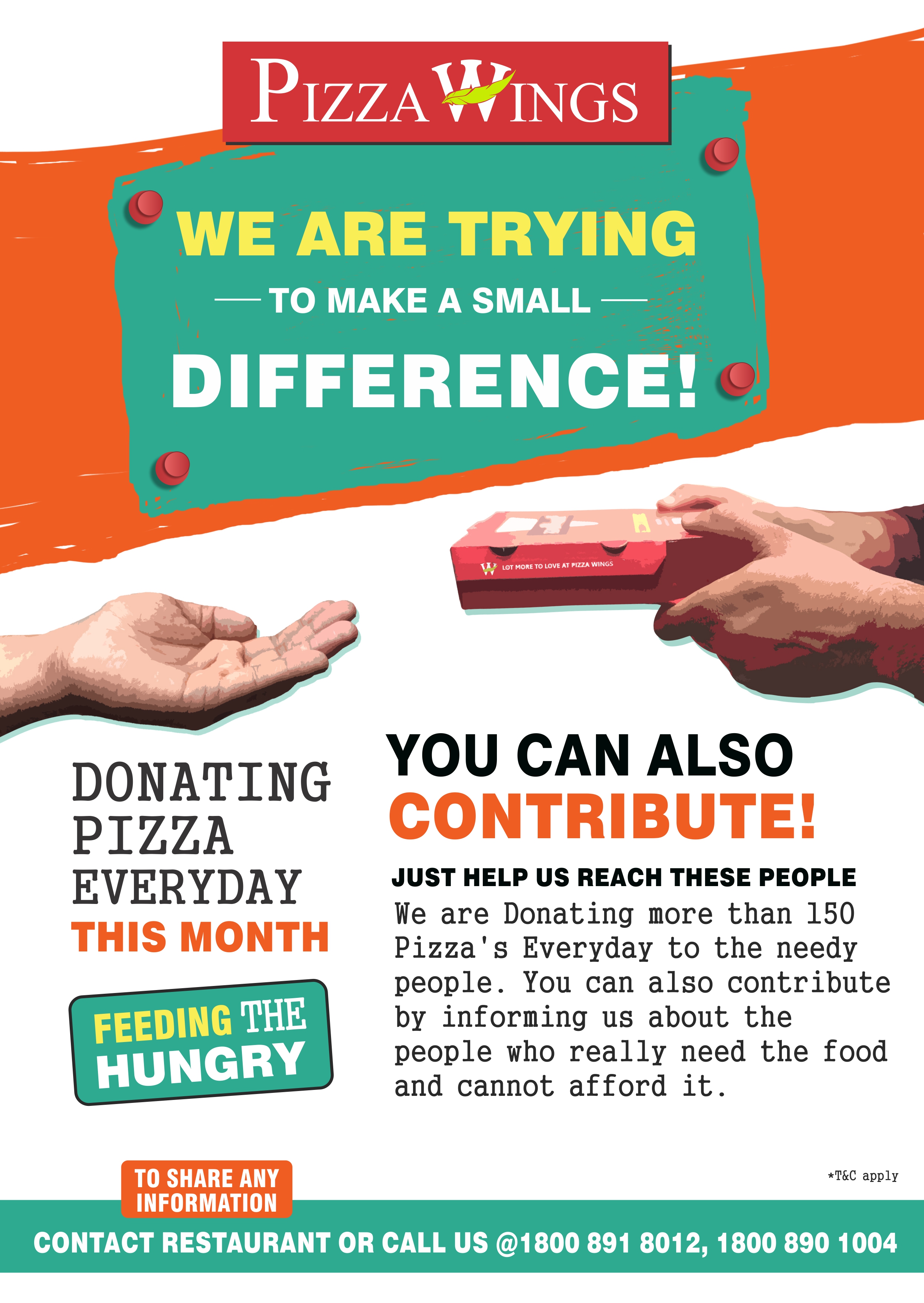 Pizza Wings, even though considered a food and pizza delivery company, Its corporate social responsibility is to thank its loyal customers and the community it serves and operates in. Company doing just that by extending a helping hand to local charity. Company has organized "Clean City Green City" programs, Blood donation camps, spread awareness in people about wastage of food and also distributed free food and pizza to helpless people. Pizza wings also putting efforts for awareness about some more social programs like beti bachao beti padhao, wear helmet while driving, use dustbins to keep city clean!